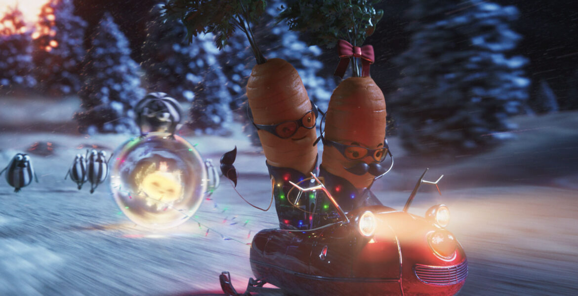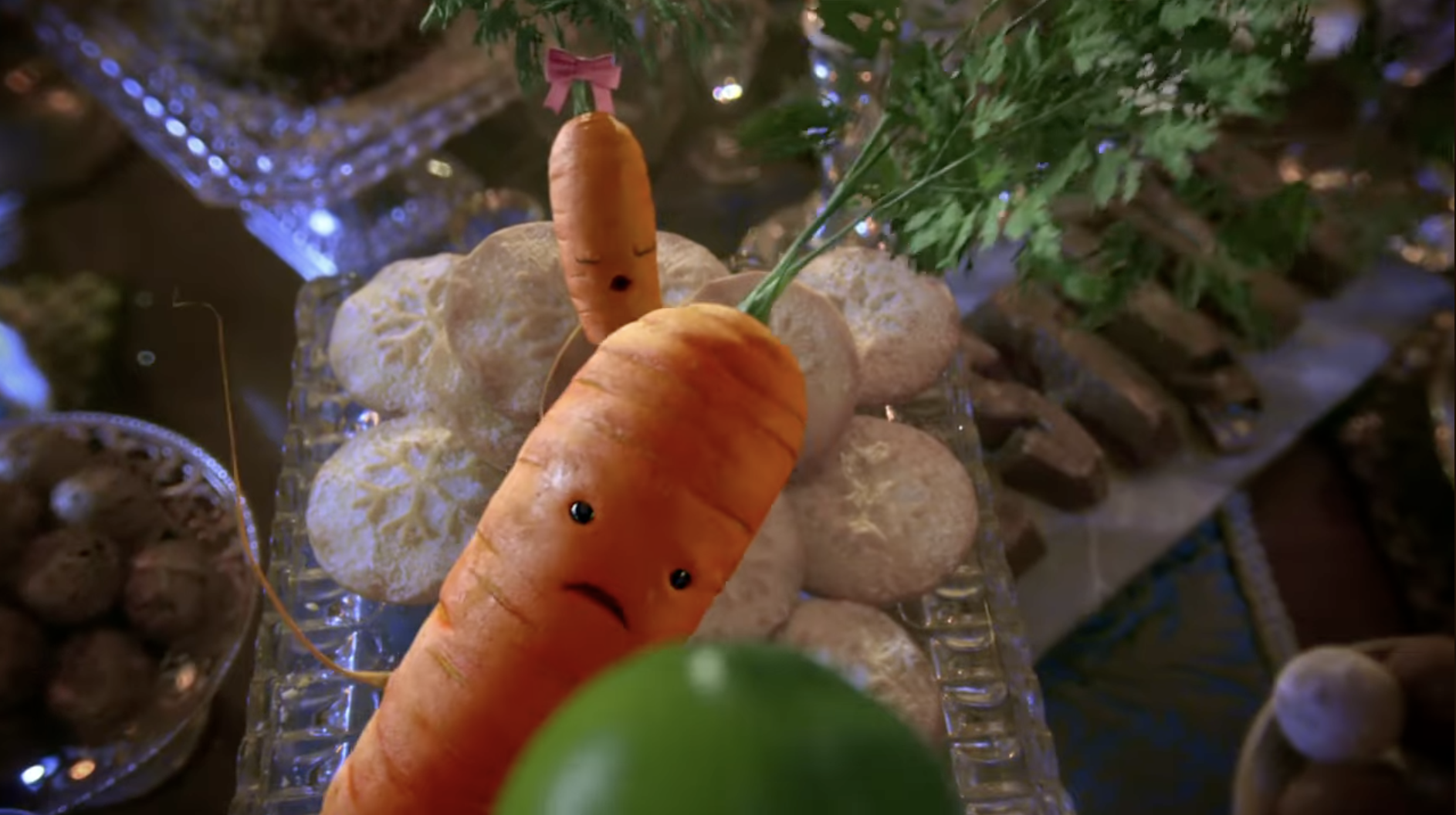 After seeing the outline of what appears to be Santa Claus on a train, Kevin dashes on board. Instead of Santa, Kevin sees Katie, another carrot relaxing amid a splendid Christmas feast. And it’s love at first sight.